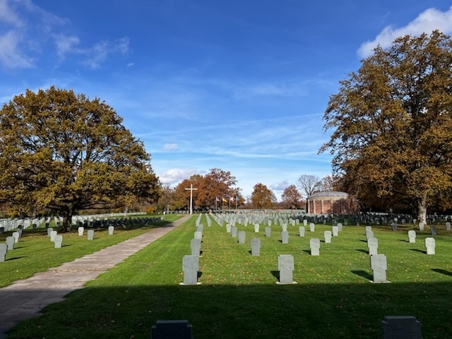 Los ging es nicht zufälligerweise an einem geschichtsträchtigen Datum – dem 11.11., also an dem Tag, an dem die deutsche Armee vor 107 Jahren den Waffenstillstand mit Frankreich schließen musste und der den 1. Weltkrieg beendete. Jahr für Jahr begeht man ihn im Nachbarland als Nationalfeiertag, um der Kriegsgefallenen zu gedenken. Um dies einmal zu erleben, besuchte die Schülerinnen und Schüler in Niederbronn im Elsass solch eine Gedenkveranstaltung. Davon ließ sich dann recht leicht ein Bogen schlagen zu der nachmittaglichen Führung über die Kriegsgräberstätte neben der Jugendherberge. In drei Gruppen führten drei Guides über das Gelände mit mehreren tausend Gräbern vornehmlich deutscher Wehrmachtssoldaten. Dabei brachten sie den Schülerinnen und Schülern die Biografien und Schicksale der dort Begrabenen näher.