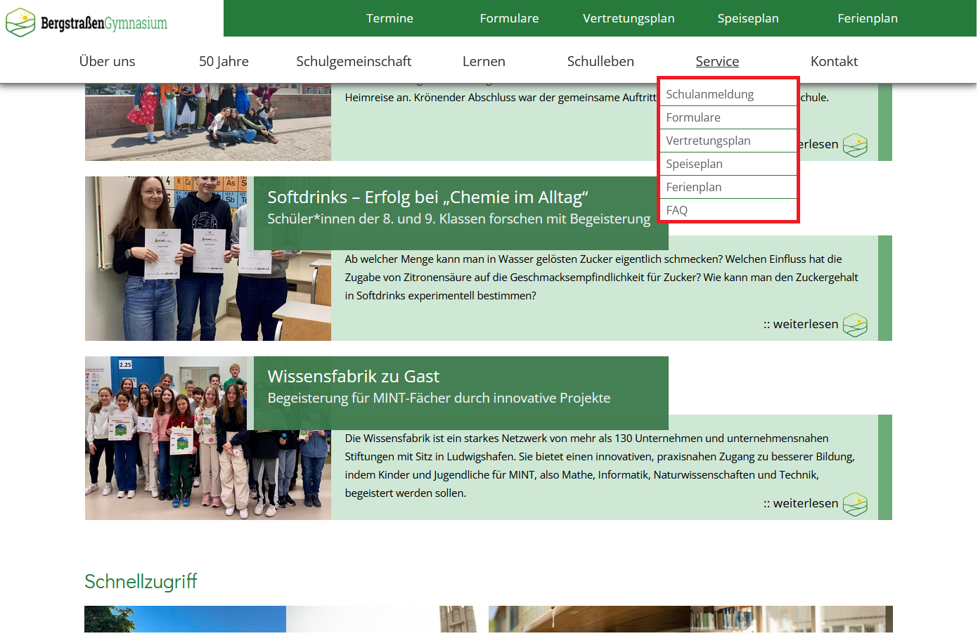 Im Bereich Service finden Sie folgende Informationen:- Schul · Anmeldung
