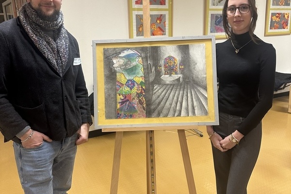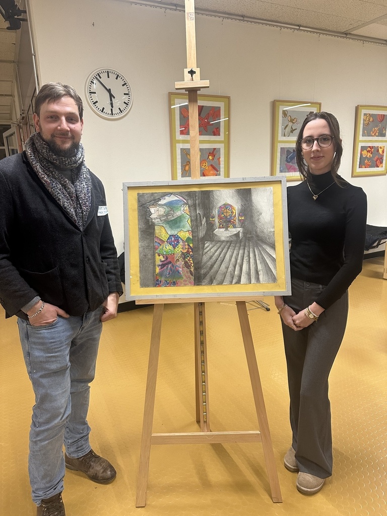 Ein weiterer Höhepunkt war die Vorstellung des „Kunstwerks des Monats“ durch Mark Slavin, Lehrer für Bildende Kunst. Das „Kunstwerk des Monats“ wird monatlich von der Fachschaft Kunst ausgewählt und soll einen Einblick in die kreativen Werke unserer Schüler*innen geben. Das ausgewählte Werk für den Monat Januar stammt von Minea Küchenmeister aus der 10. Klasse und trägt den Titel „Durchbruch“. Es vermittelt neue Einblicke in dunkle Räume und zeigt symbolisch das Licht in einer kalten, dunklen Kirche, das durch ein buntes Kirchenfenster zum Durchbruch kommt. Die Auswahl fiel den Lehrkräften nicht leicht, verdeutlichte aber die Vielfalt und Kreativität, die an unserer Schule entsteht. Ab Januar wird das „Kunstwerk des Monats“ regelmäßig auf der Homepage präsentiert.